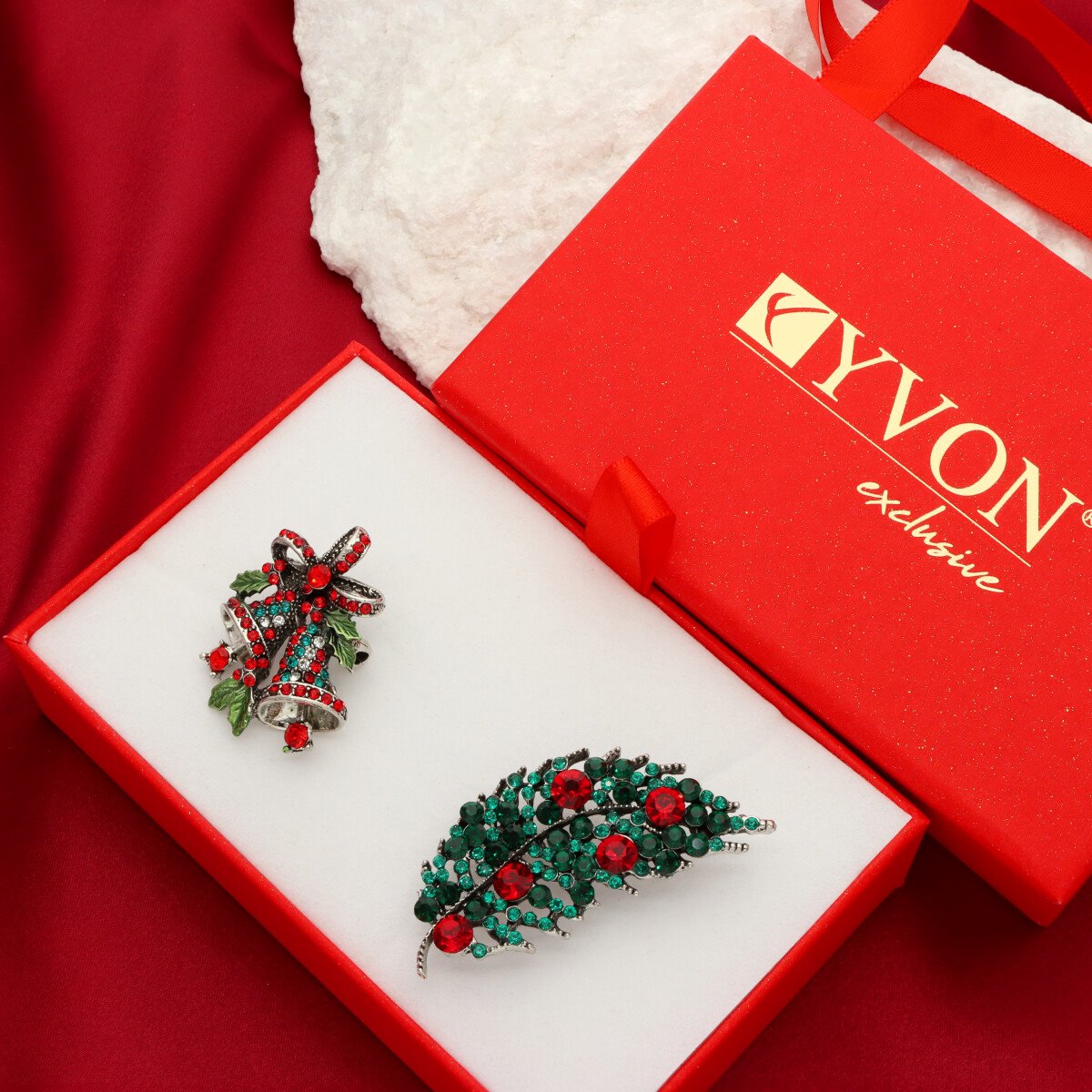 Zestaw dwóch świątecznych broszek YVON. Idealny pomysł na prezent - całość zapakowana jest w eleganckim czerwonym wysuwanym pudełku. Dopełnieniem może okazać się czerwona świąteczna torebeczka P5031.