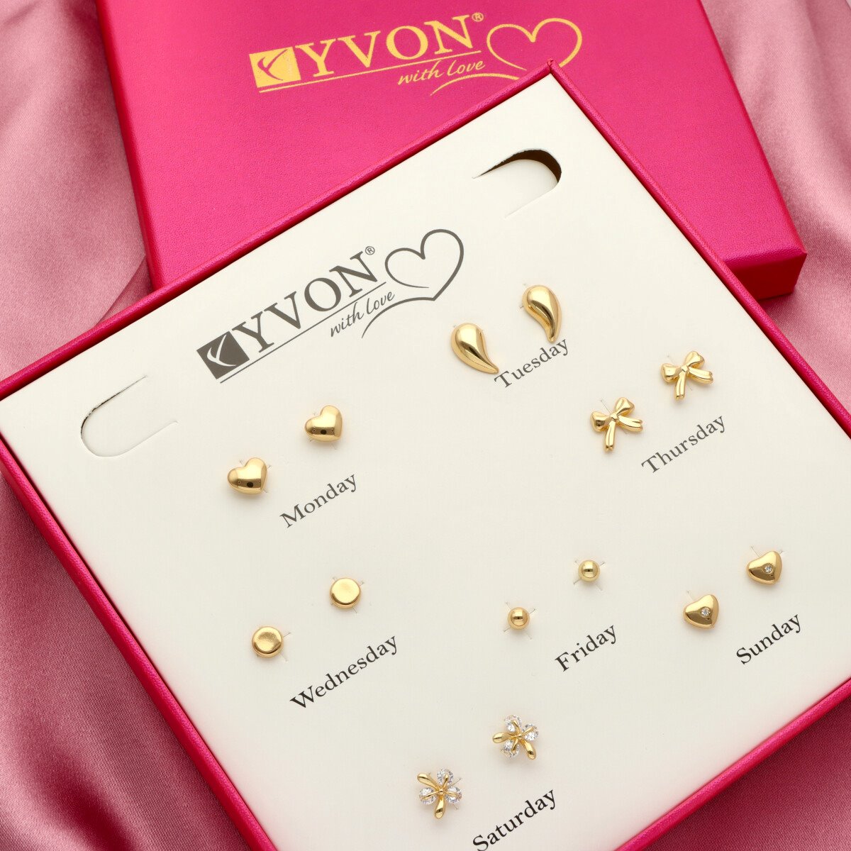Eleganckie opakowanie z podziałem na dni tygodnia podkreśla koncepcję „kolczyki na każdy dzień”.
