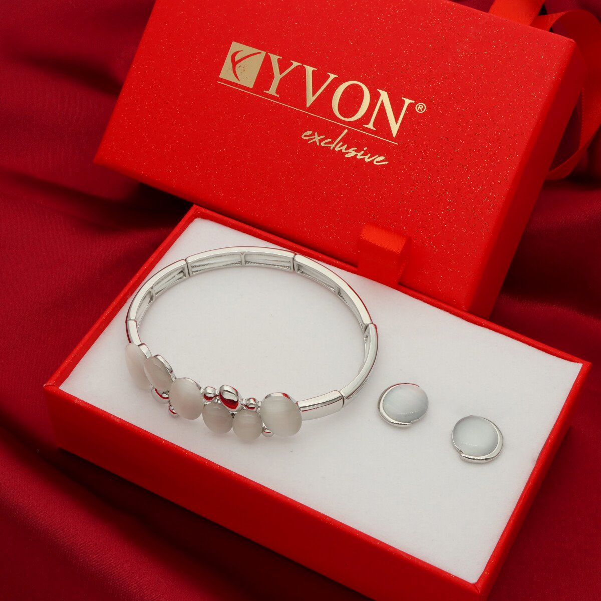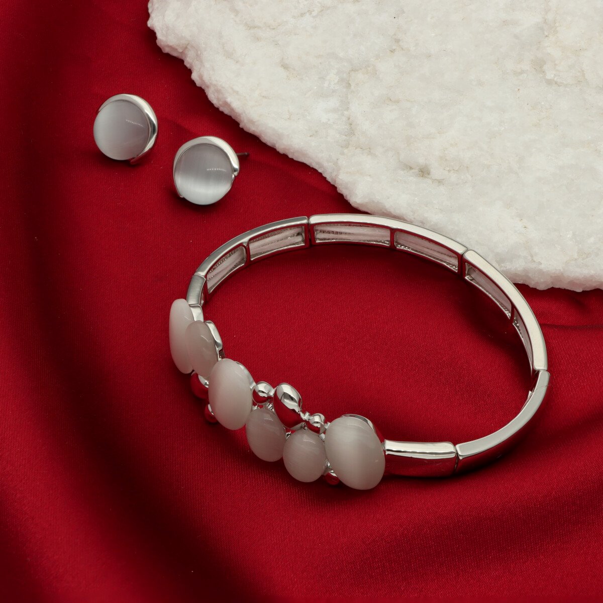 Zestaw wysokiej jakości biżuterii (bransoletka i kolczyki), wykonanej z metalu antyalergicznego i naturalnego kwarcu. Idealny pomysł na prezent. W eleganckim pudełeczku GRATIS (uwaga: pudełeczko może się różnić o załączonego na zdjeciu; będzie czerwone lub białe).