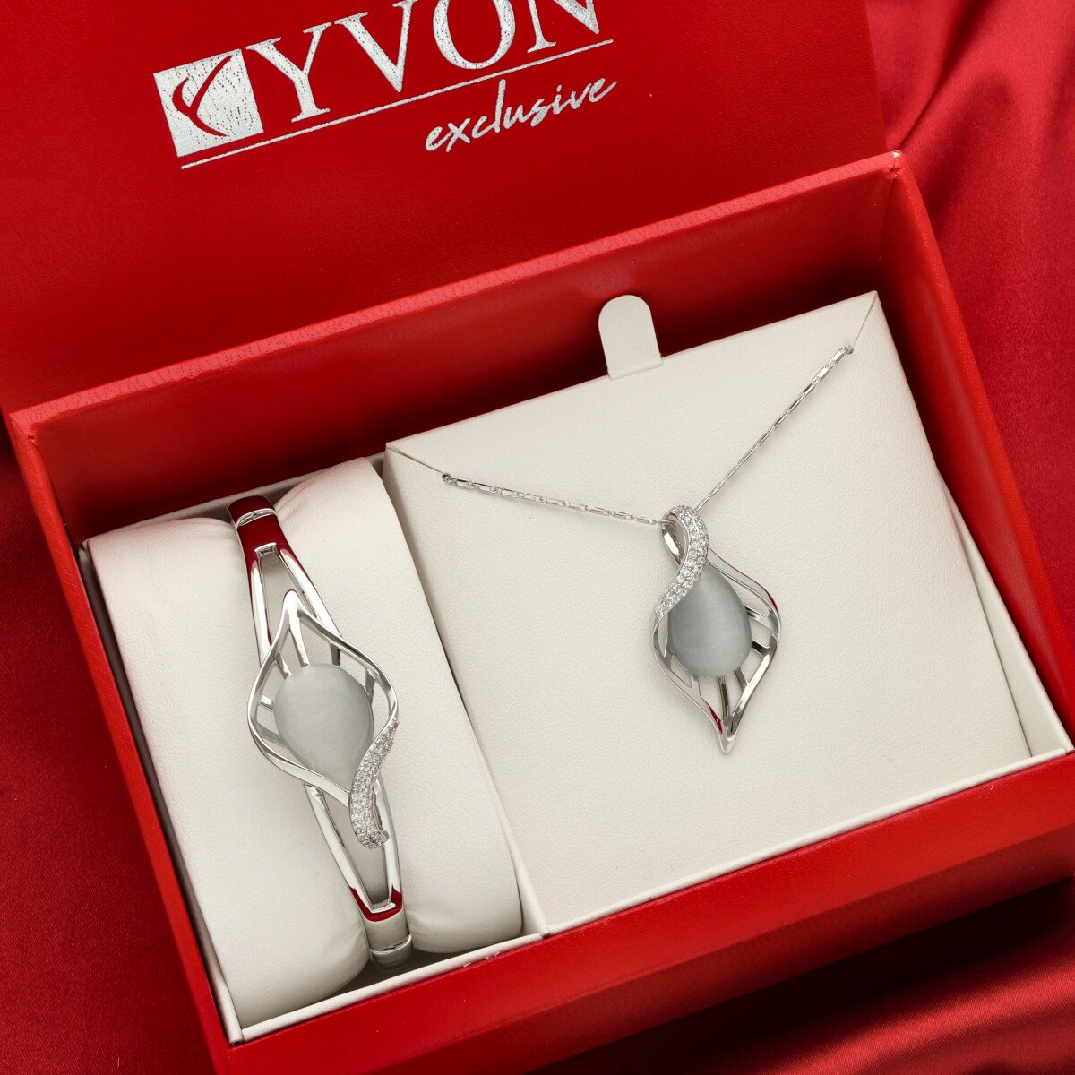 Naszyjnik i bransoleta tworzą spójny, harmonijny komplet, idealny do eleganckich stylizacji i wieczorowych zestawów. Każdy zestaw pakowany jest w duże, ekskluzywne pudełko prezentowe YVON, zaprojektowane tak, aby pomieścić cały komplet i podkreślić jego luksusowy charakter.
