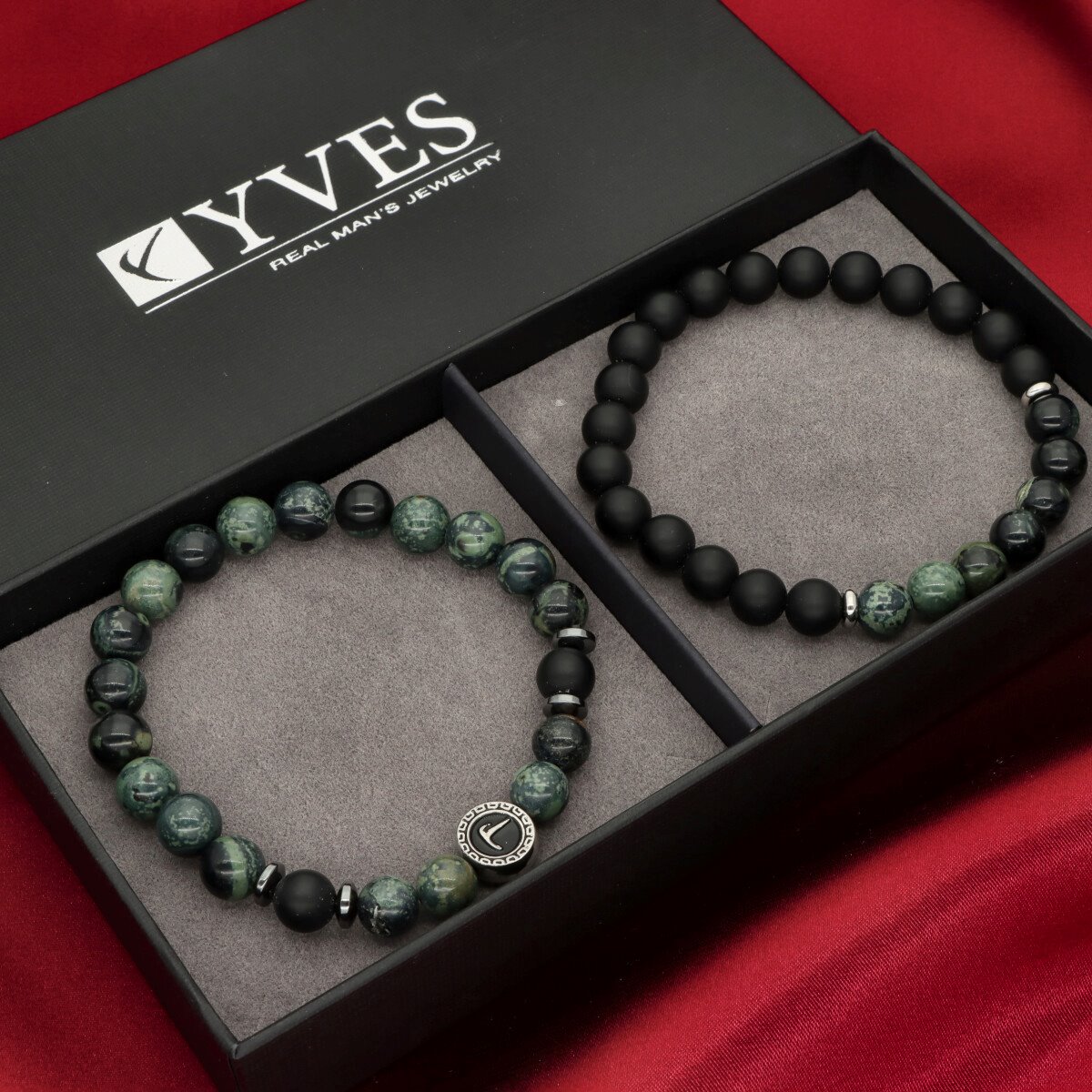 Bransoletki osadzone są na elastycznej, mocnej lince, dzięki czemu dopasowują się do nadgarstka. Całość zapakowana w stylowe, czarne pudełko sygnowane logo YVES – Real Man's Jewelry.